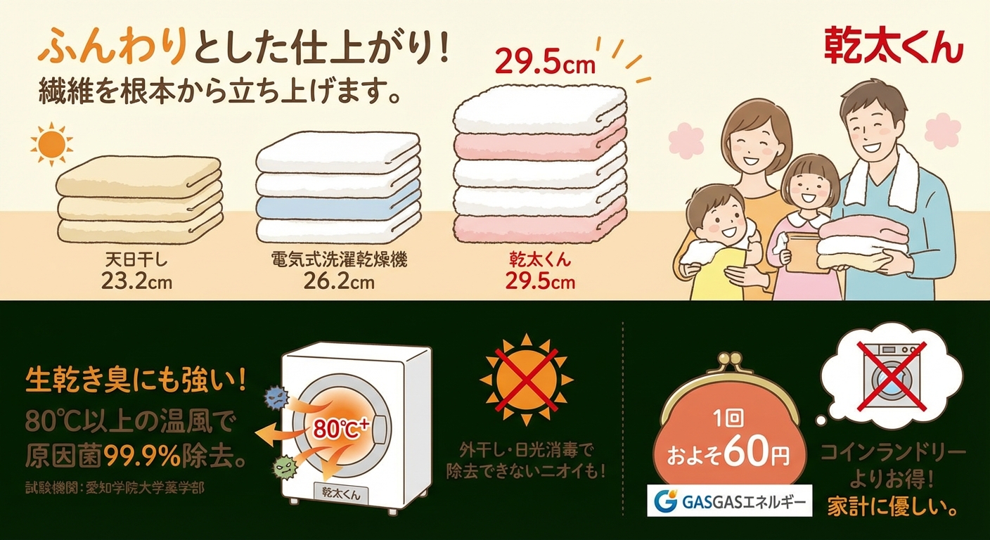 そして気になる1回のコストですが、GASGASエネルギーのサービスページによると、1回の乾燥でおよそ60円という家計に優しい設計です。コインランドリーに何度も行く手間や費用と比べると、かなりお得に使えます。