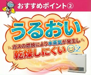 ガスは燃焼する際に水蒸気を発生させるため、お部屋を暖めながら同時に適度な「うるおい」も与えてくれます。