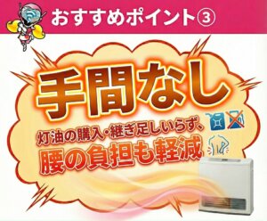 ③:面倒な給油や重い灯油の運搬は一切不要!
