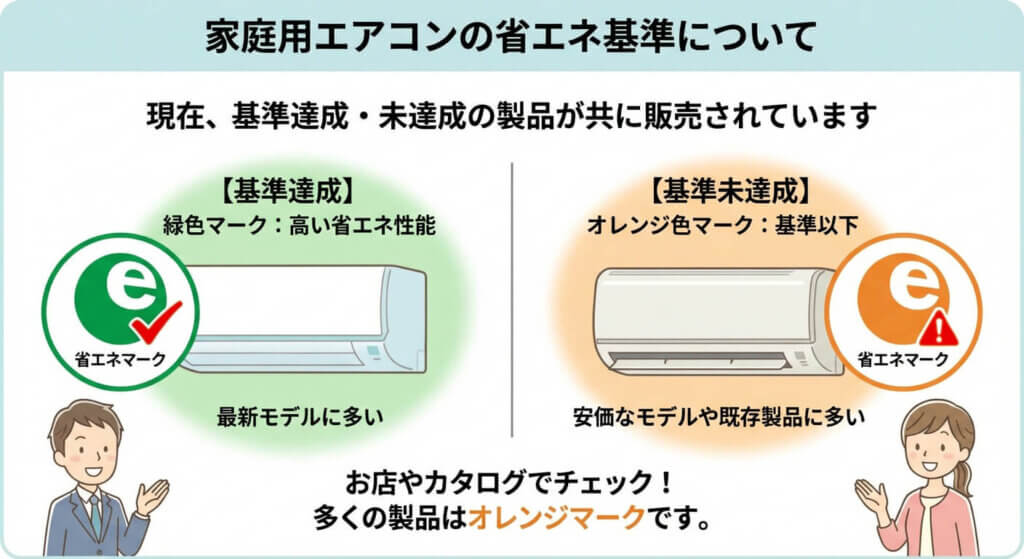 家庭用エアコンには国が定めた「省エネ基準」があります。現在は、この基準を達成している製品も、達成していない製品も、どちらも販売することができます。